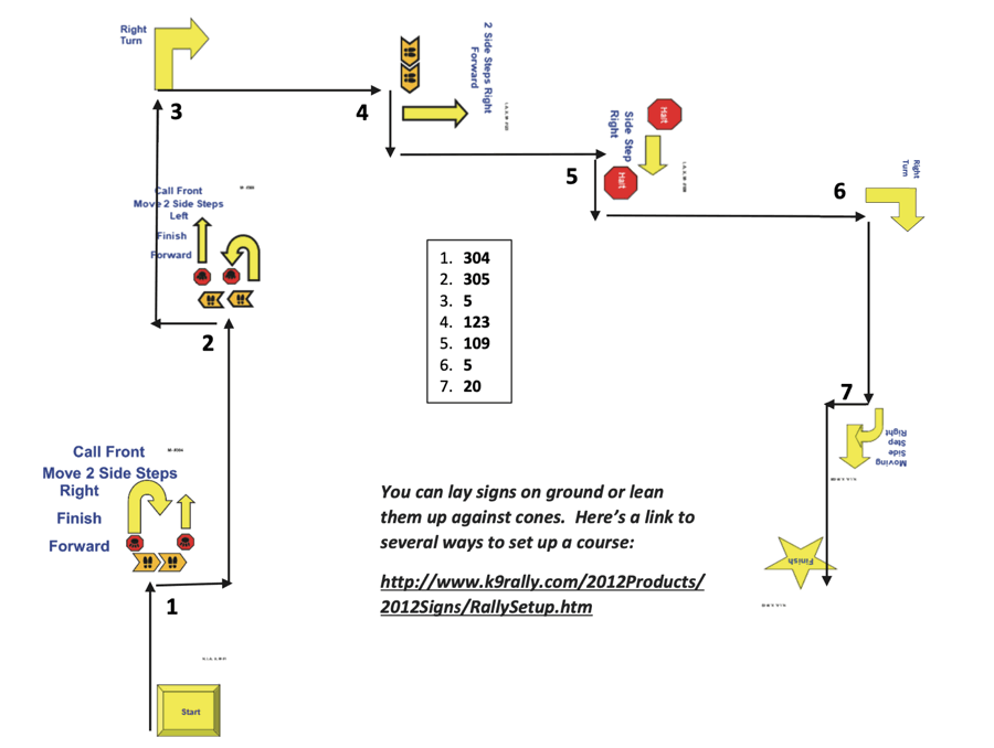 Are you ready to try your first challenge using AKC Rally signs using side steps? The signs I’ll be using are #s 304, 305, 123, 109 and 20.